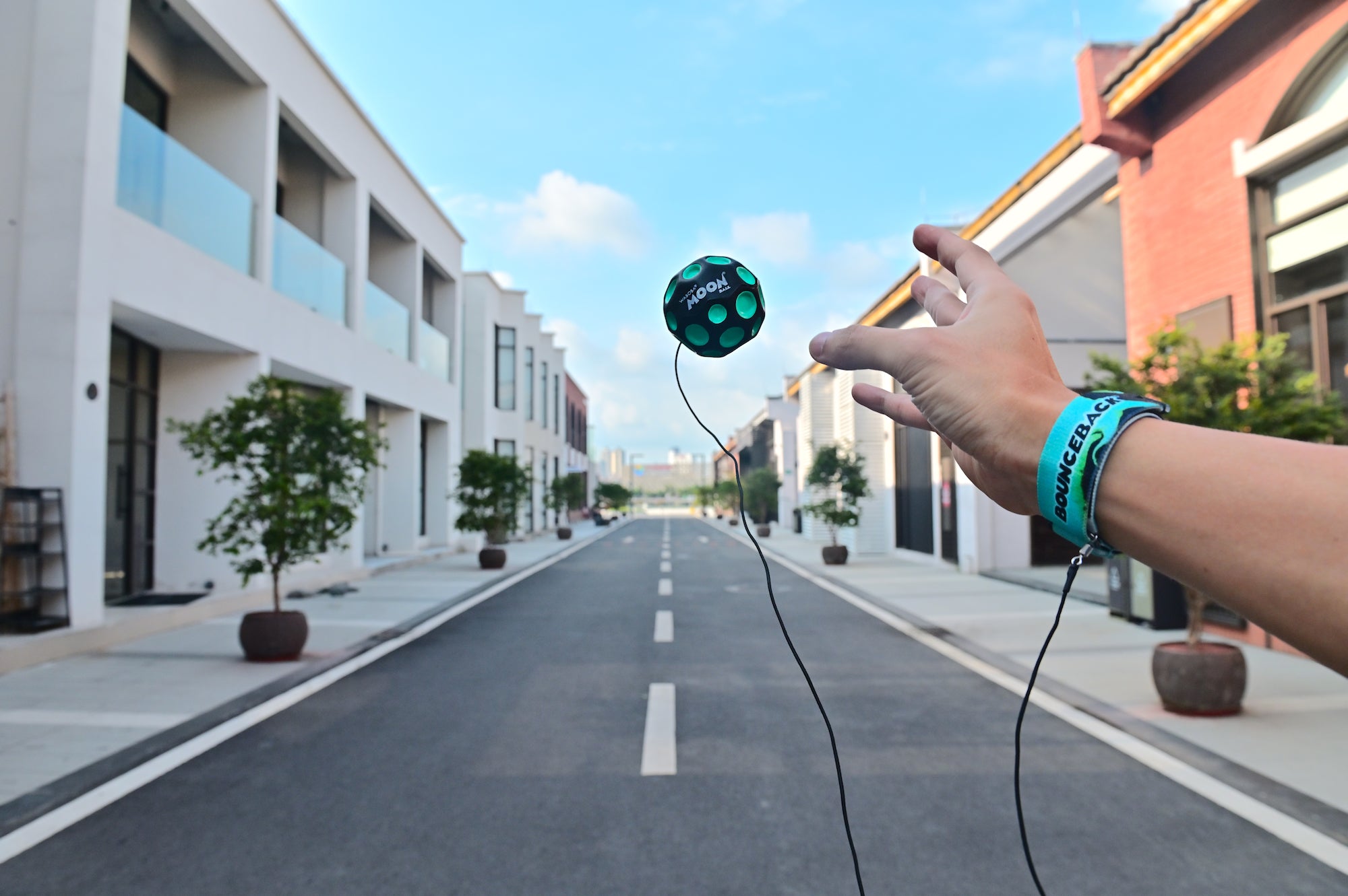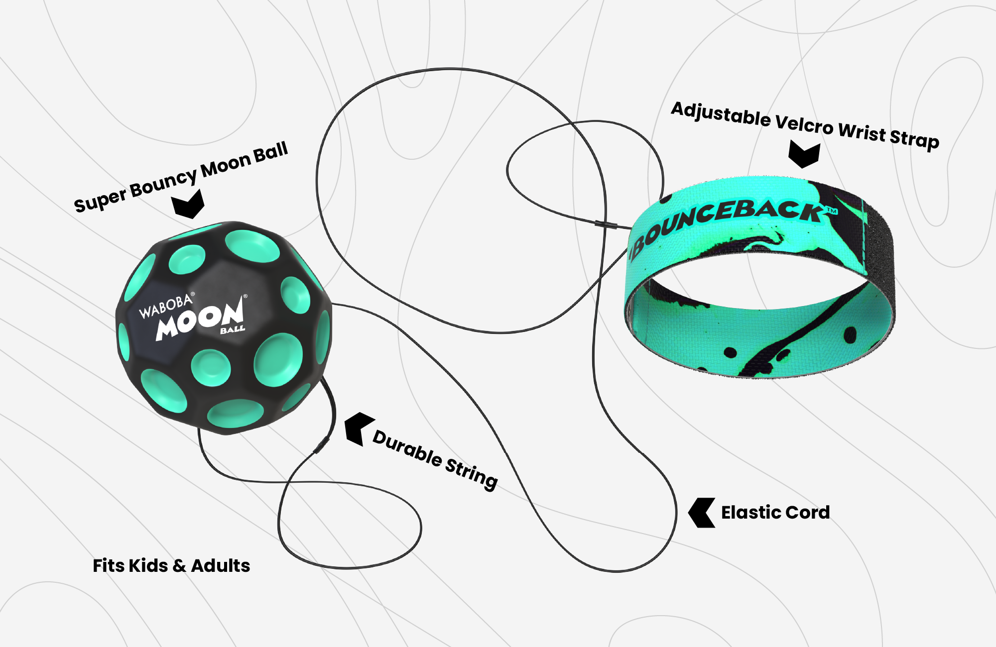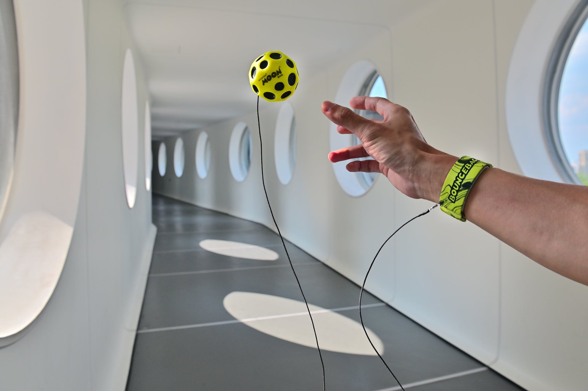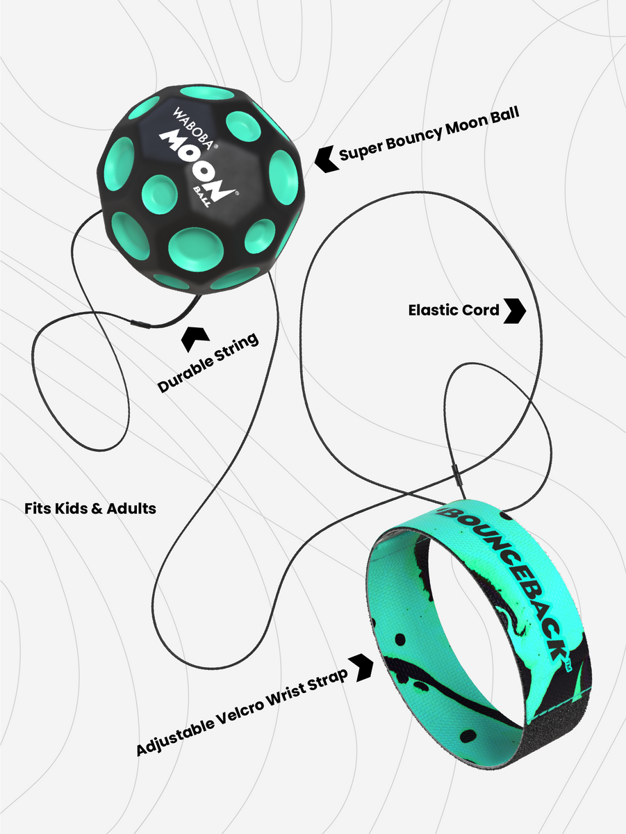 Gehen Sie mit Ihrem Moon Ball spazieren und springen Sie zurück, wenn Sie eine Pause brauchen. Schnallen Sie sich an und erleben Sie den Moon Ball auf ganz neue Weise. Bounceback besteht aus einem Moon Ball an einer Leine, die Sie mit einem verstellbaren Armband tragen. Es macht süchtig, überall herumzuspringen! Werfen Sie ihn einfach vor sich, damit er springt, und fangen Sie ihn beim Rückprall wieder auf!